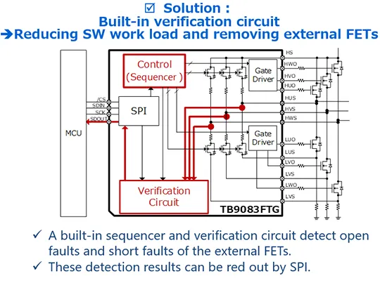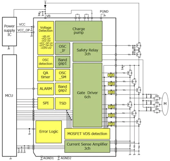 东芝电子元件及存储装置株式会社(“东芝”)推出符合ISO26262标准,支持ASIL-D安全等极[4]的车载3相直流无刷电机栅极驱动IC[3]-“TB9083FTG” [4]。该器件驱动外部 MOSFET 以旋转3相直流无刷电机(图1),并且可驱动所有3相的上下MOSFET,即六个MOSFET。器件适用的应用示例包括电动助力转向系统(简称EPS)、电动制动和线控换档系统。